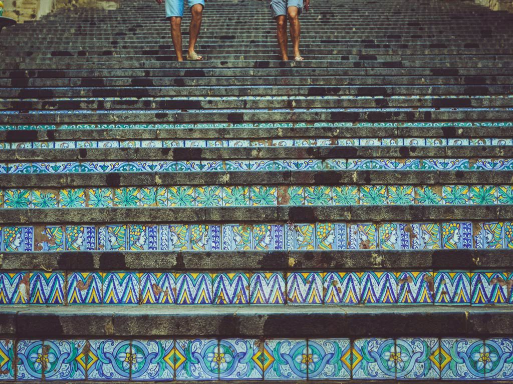 La fama mondiale di Caltagirone si deve alle sue ceramiche, di probabile influenza araba, che adornano i luoghi simbolo della città con i loro caratteristici colori giallo, blu e verde e le forme geometriche o floreali che raffigurano. Ne è un esempio la scenografica scalinata della Chiesa barocca di Santa Maria del Monte, adornata con maioliche in stile calatino realizzate da artigiani locali, la cui bellezza viene esaltata ogni anno a fine luglio durante la tradizionale Infiorata.