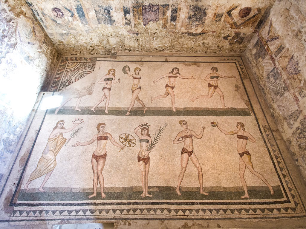 A pochi chilometri da Caltagirone, Piazza Armerina conserva un supremo esempio di antica villa romana nobiliare, celebre per i ricchi mosaici policromi, figurativi e geometrici, perfettamente conservati, che ne decorano i pavimenti per oltre 3.500 mq. Tra scene di vita quotidiana e di caccia agli animali esotici utilizzati nelle venationes o esibiti in zoo privati, le rappresentazioni più celebri sono “Le ragazze in bikini” nella Sala dell’Otium, raffigurante delle giovani intente a giocare, in abiti succinti che richiamano dei moderni costumi da bagno.